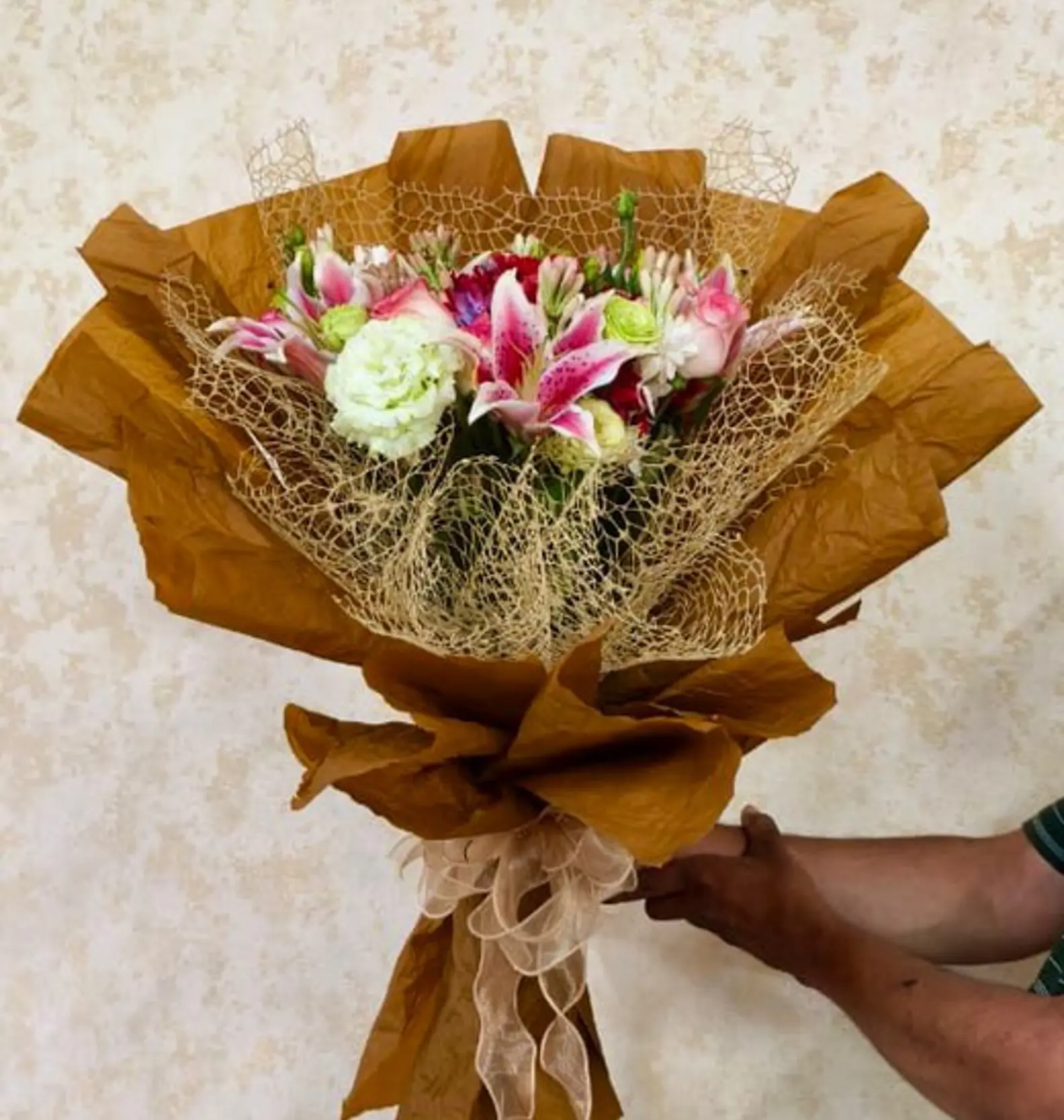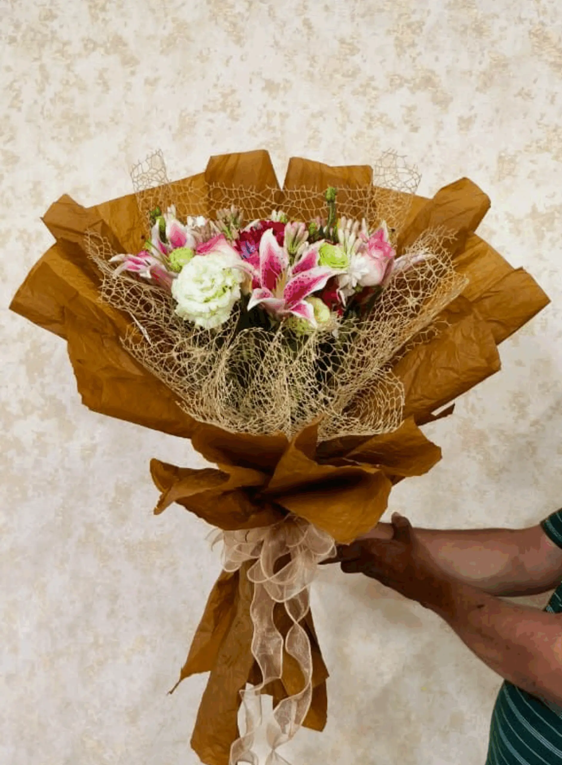 This elegant hand bouquet spotlights vibrant stargazer pink lilies, delicate light pink roses, and crisp white lisianthus. All blooms are carefully arranged by floral designers and wrapped in a striking golden mesh and rustic brown paper. A sheer ribbon adds a refined touch. The bouquet is ideal for birthdays, anniversaries, and heartfelt gifting, offering color, fragrance, and style. Enjoy same-day fresh delivery in Bangalore for this show-stopping combination of premium flowers and creative wrapping.