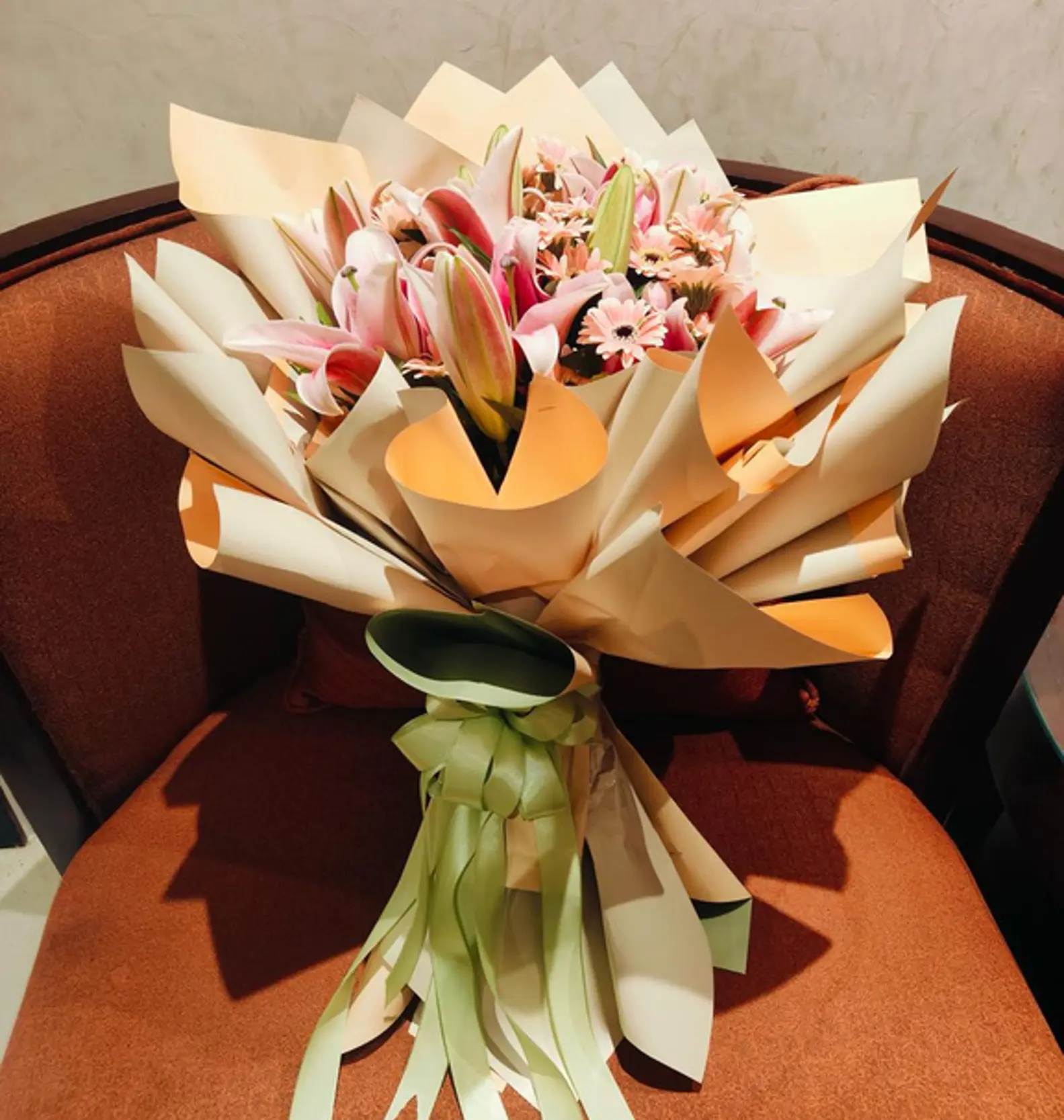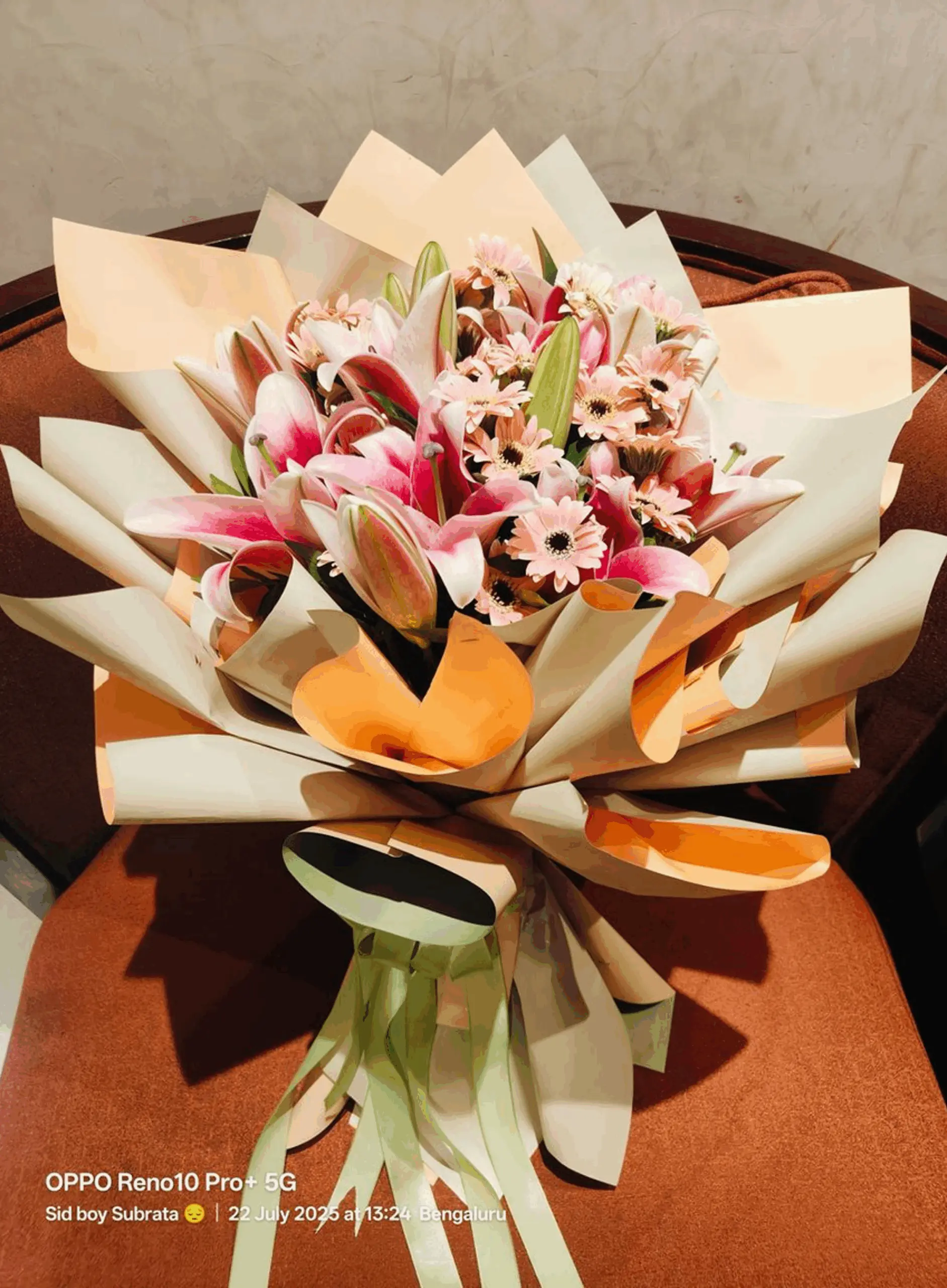 A radiant and cheerful bouquet combining fresh pink oriental lilies and delicate light pink gerbera daisies. Each stem is carefully selected to ensure vibrant color and graceful form, and the arrangement is hand-tied in premium layered peach and cream wrapping. Finished with a soft green ribbon, this bouquet is perfect for birthdays, celebrations, or expressions of admiration. Enjoy timely hand delivery anywhere across Bangalore with this lively and stylish floral arrangement.