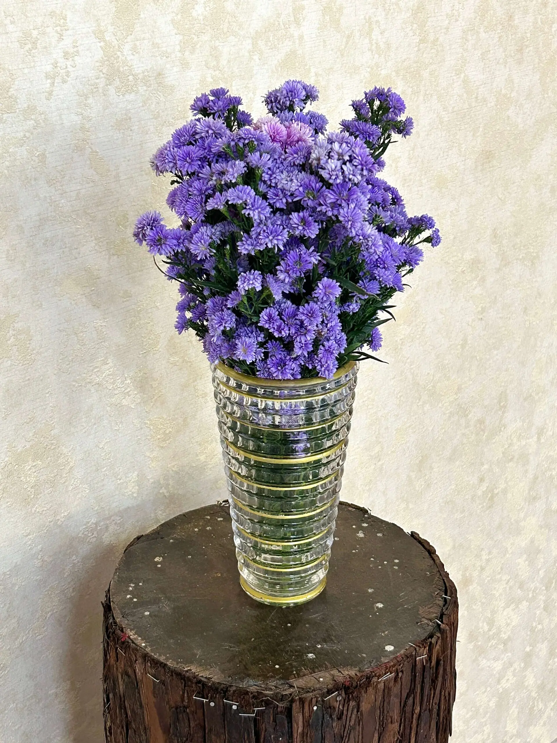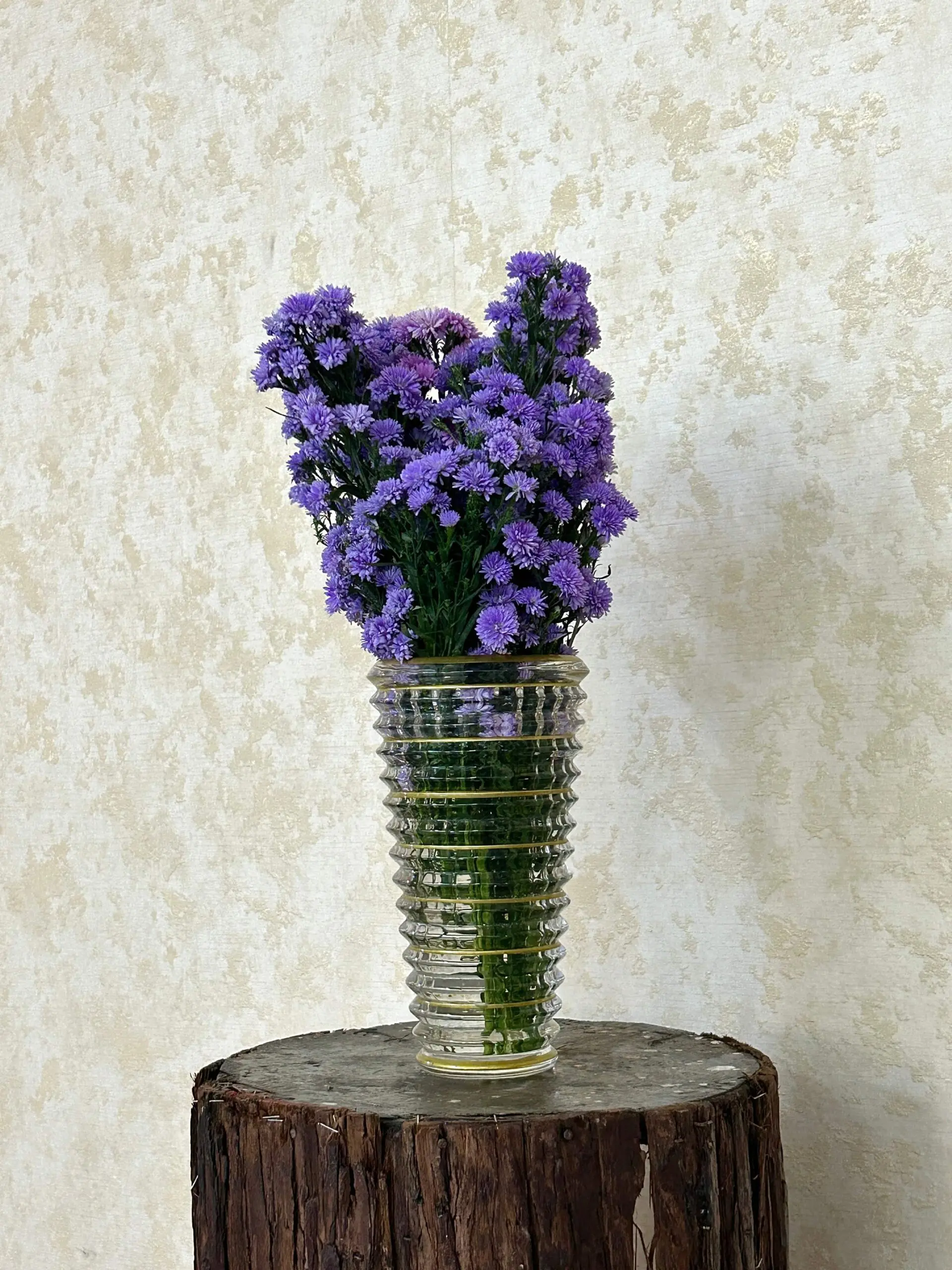 Elevate your space with this modern vase display of fresh purple aster blooms, arranged in a tall ribbed clear glass vase. These carefully selected, long-stem purple asters exude cheerfulness and lasting vibrancy. Ideal for homes, offices, receptions, or gifting occasions, this arrangement offers both longevity and eye-catching beauty. Same-day delivery available anywhere in Bangalore.