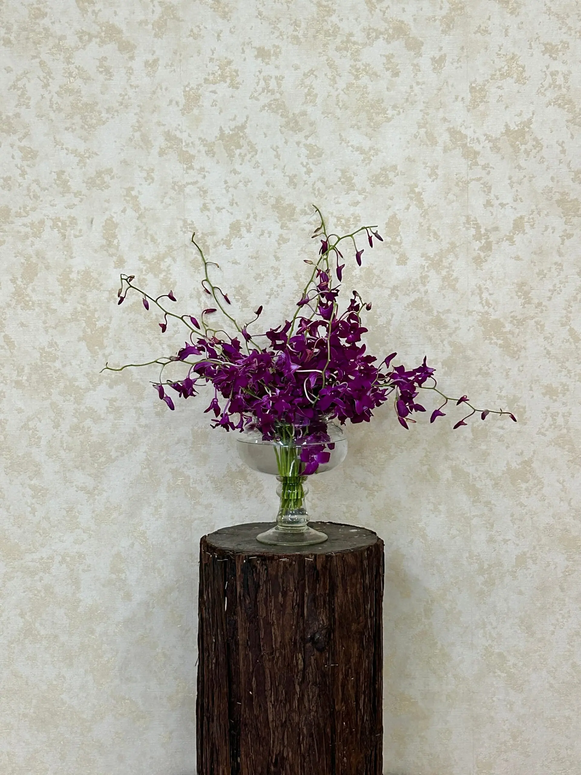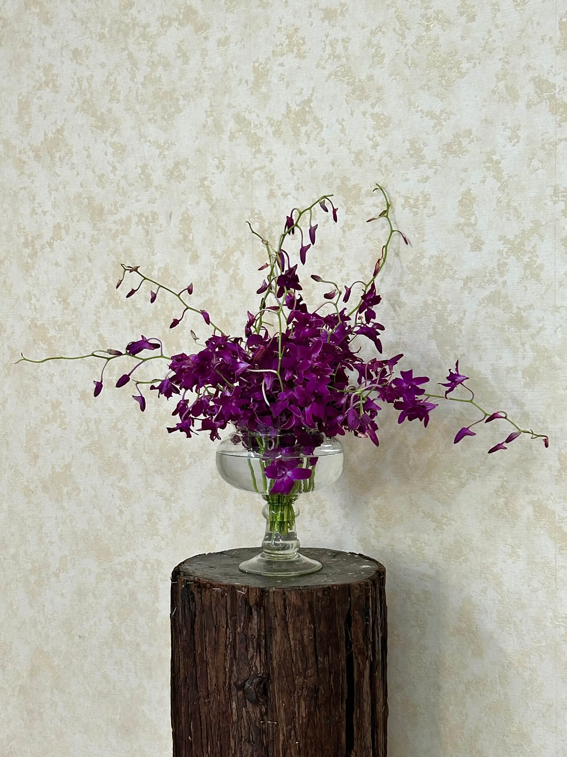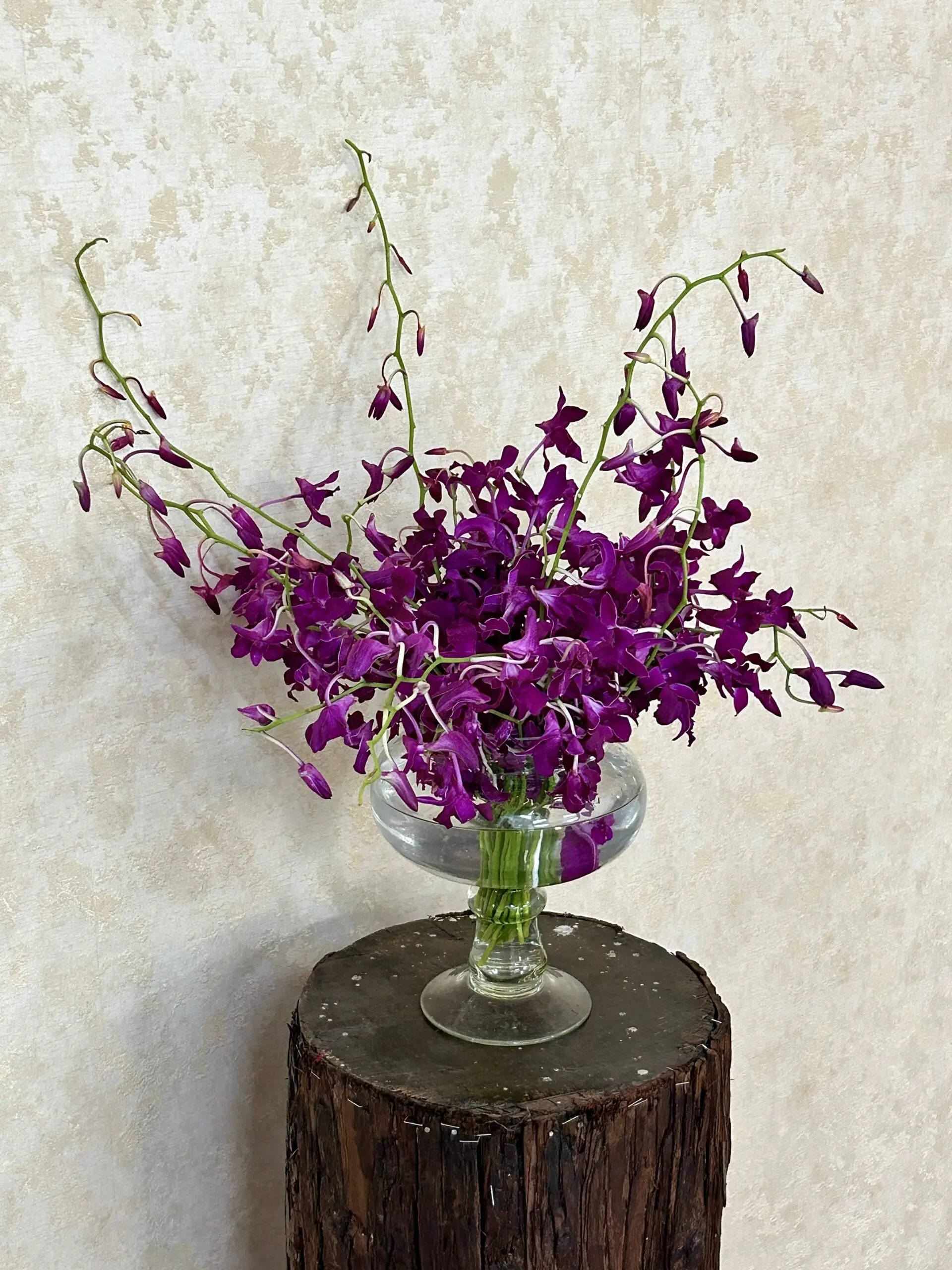 A premium vase arrangement of long-stemmed purple dendrobium orchids, fresh and dramatic, showcased in a classic glass pedestal vase. These orchids are selected for their color and lasting beauty, arranged for a full, sculptural look that brightens any home, office, or event. Ideal for gifting and stylish decor, with prompt delivery available in Bangalore.