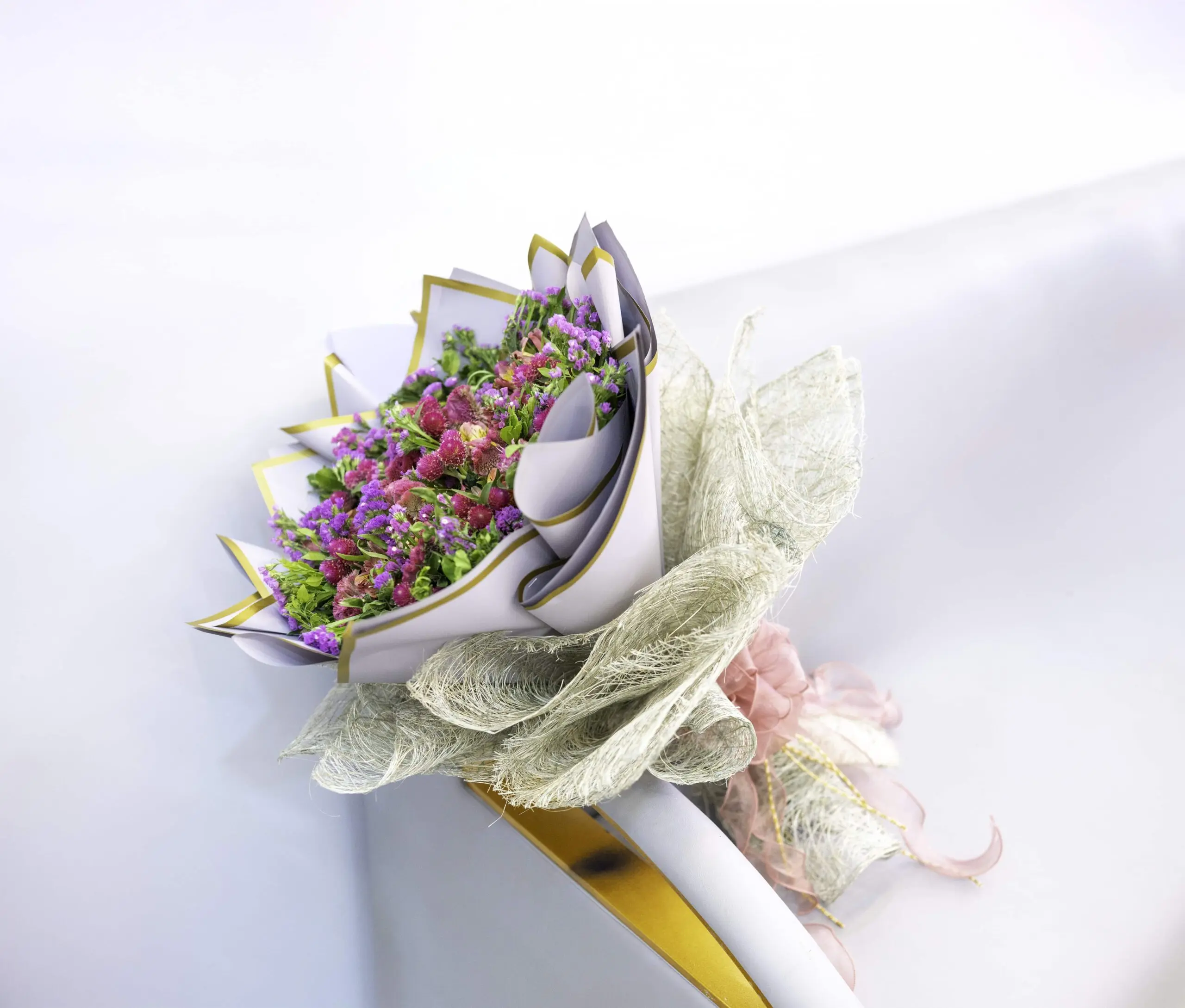 Showcasing vivid shades and natural textures, this elegant bouquet blends purple statice, pink gomphrena, and lush green foliage for a uniquely lively arrangement. Hand-tied and wrapped in luxe white and gold paper, the bouquet is finished with a striking mesh gold bow and soft pink ribbon accent. Perfect for birthdays, celebrations, or thoughtful gifting, these blooms are selected for lasting freshness and color. Available for same-day delivery in Bangalore.