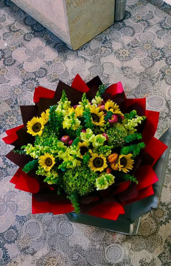 A bold and joyful medley of vibrant sunflowers, green hydrangeas, snapdragons, and exotic fillers—wrapped in deep crimson layers to amplify its festive flair. This large-format bouquet is perfect for grand gestures, housewarmings, or to brighten up luxury spaces with its radiant energy and earthy charm. Designed with a dramatic yet balanced aesthetic, it reflects the warmth and grandeur that defines Floral Bazaar’s signature style.