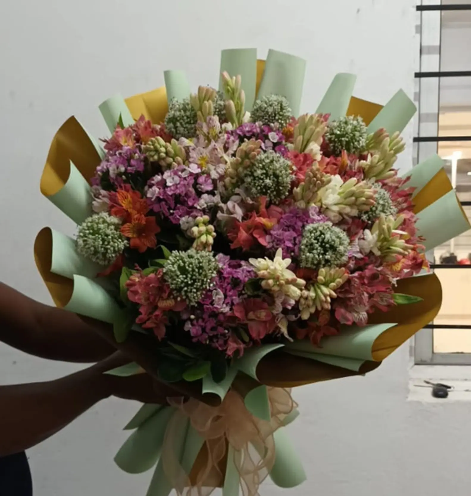 Bursting with fragrance and color, this handcrafted bouquet blends pure white tuberose, lively orange and pink alstroemeria, delicate pastel pink hydrangeas, and lilac statice for a truly stunning arrangement. Presented in layers of mint green and gold wrapping and finished with a soft sheer ribbon, it captures elegance and freshness. Ideal for birthdays, anniversaries, festive occasions, or sending joyful wishes, each stem is selected for beauty and longevity. Enjoy prompt delivery in Bangalore with this premium bouquet of exotic seasonal blooms.
